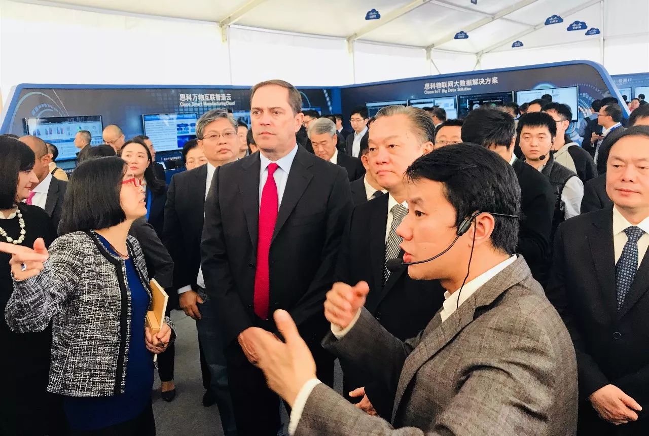 圖為碧桂園首席戰(zhàn)略官林昭憲,思科全球首席執(zhí)行官 Chuck Robbins(羅卓克),廣東省惠州市委書記、市人大常委會主任陳奕威,廣東省惠州市委副書記、市政府市長、黨組書記麥教猛等在安捷展區(qū)駐足交流。