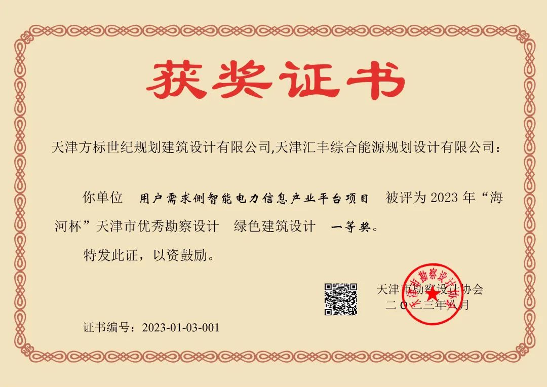 近日,由天津安捷物聯(lián)科技股份有限公司下屬全資子公司:天津匯豐綜合能源規(guī)劃設(shè)計(jì)有限公司(以下簡稱“匯豐設(shè)計(jì)”)與天津方標(biāo)世紀(jì)規(guī)劃建筑設(shè)計(jì)有限公司聯(lián)合申報(bào)的用戶需求側(cè)智能電力信息產(chǎn)業(yè)平臺項(xiàng)目,榮獲2023年“海河杯”天津市優(yōu)秀勘察設(shè)計(jì)綠色建筑設(shè)計(jì)一等獎,在綠色建筑類別中,為唯一的一項(xiàng)一等獎(綠色建筑類別中,共4個獲獎項(xiàng)目,其中一等獎1項(xiàng),二等獎1項(xiàng),三等獎2項(xiàng))。